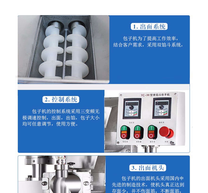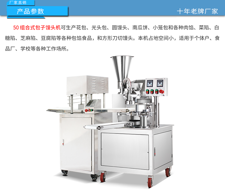 50 自動(dòng)組合式包子饅頭機(jī)系列,可生產(chǎn)花包、光頭包、圓饅頭、南瓜餅、小籠包和各種肉餡、菜陷、純白糖陷、芝麻陷、豆腐陷等各種包餡食品。本機(jī)占地空間小,適用于個(gè)體戶、食品廠、學(xué)校等各種工作場(chǎng)所。