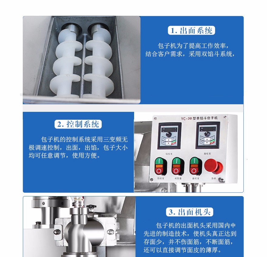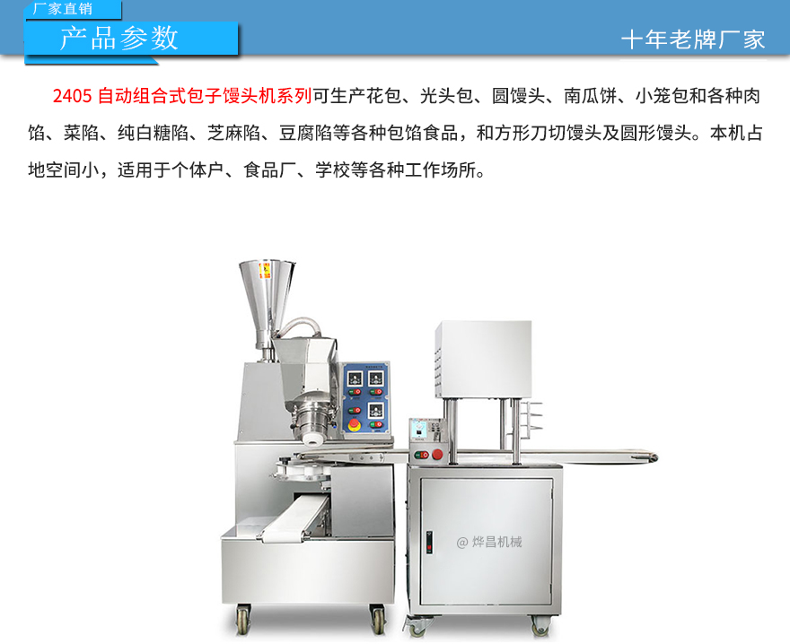2405型自動組合包子饅頭機,可生產(chǎn)各種不同餡料的包子、南瓜餅、小籠包、圓饅頭、方形饅頭等各種包餡類產(chǎn)品。適用于個體戶、食品廠、學校等各種工作場所。